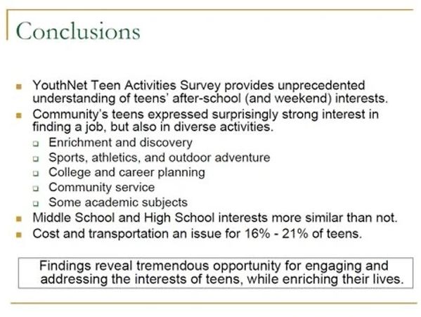 In 2009, YouthNet surveyed South Orange and Maplewood teens to better understand their attitudes and interests towards after-school activities and social concerns. Over 1000 middle school and 1200 high school students responded to the survey.